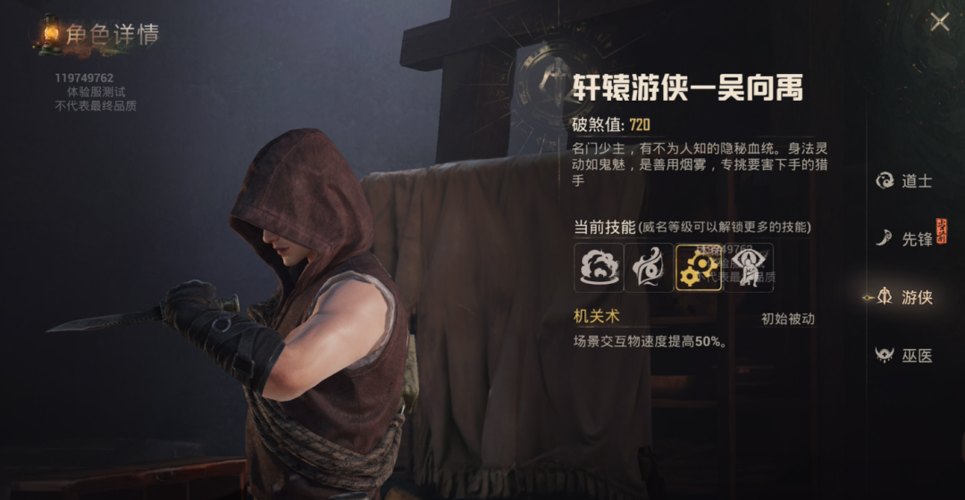 另一方面,古墓迷途角色的技能也是“多分支”非固定化的,从体验看项目组至少提供了服务于PVE和PVP不同倾向的数套技能。比如轩辕游侠吴向禹背刺高伤、突进换弹、灵视看周围敌人、降低脚步显示的隐秘等等,单角色就能玩出多种花样,再搭配队友的辅助技能,会有更多身法层面或是战术层面的变化。