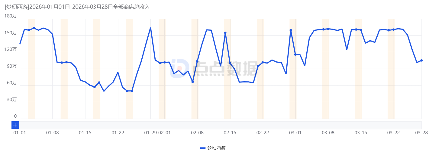 网易《梦幻西游》3 月收入数据显示:当月共有17天单日收入超1035万元,单日最低收入约621万元,整体营收稳定维持在828万至1035万元区间,相较1、2月走势平稳。该游戏2月收入约为1.9亿元,3月收入约3.1亿元,同比增长58%。