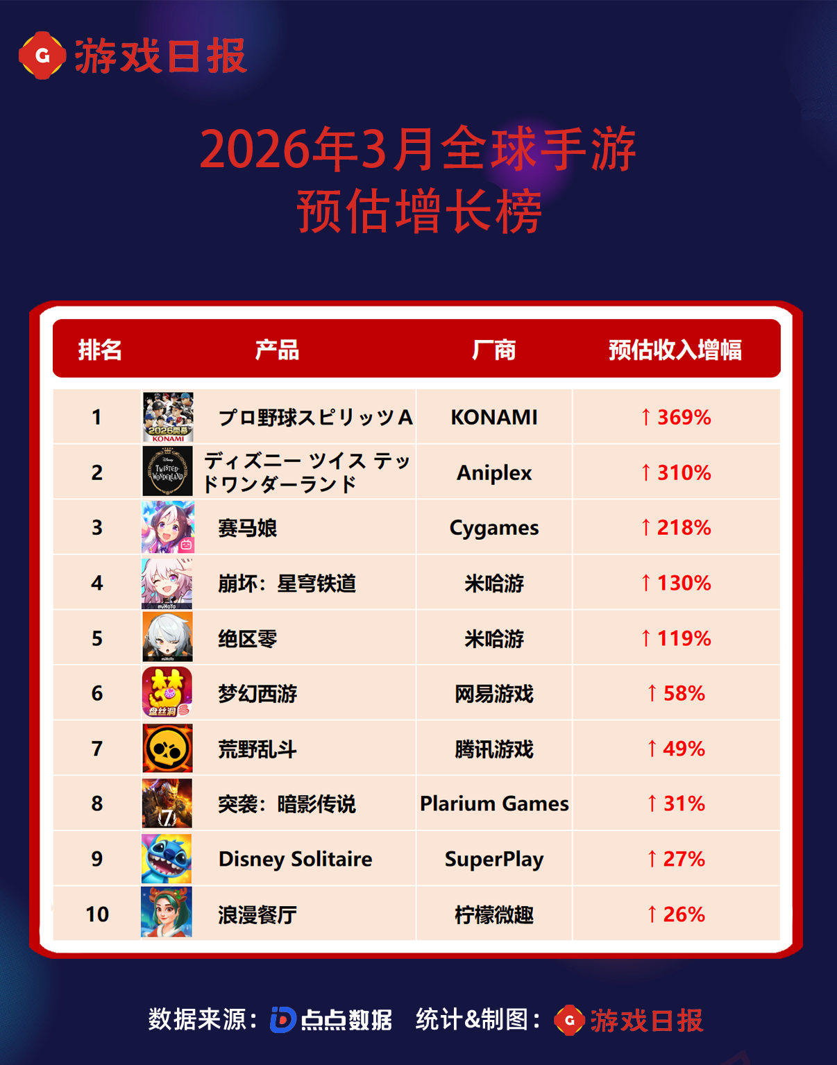 KONAMI职业棒球手游《职业棒球精神A(プロ野球スピリッツA)》3月全球预估收入为2.8亿元,较2月增长369%。该游戏于3月13日和14日单日收入突破1381万元,3月19日至24日维持在1381万至1726万元之间。日本职业棒球联赛于3月举行,游戏在3月举办了东京粉丝节等多个活动,推出赛季开幕限定S级选手卡池与纪念福利等,3月内多次登顶日区畅销总榜第一。