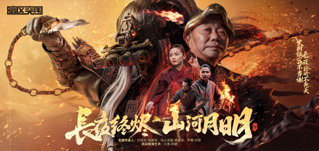 有火了,还要更亮、更震撼、更有分量的火。抱着这样的目标,《暗区突围》想到了黑暗中最耀眼的火——打铁花。打铁花是一种存在危险性的非遗技艺表演,铁水温度高达1600度,尽管被打到高空绽放开来,落到人的身上依旧会有灼烧般的痛感。这要求打铁花的师傅斗志、力量、技艺缺一不可,这种匠人精神完美契合甲胄所代表的坚韧、守护。